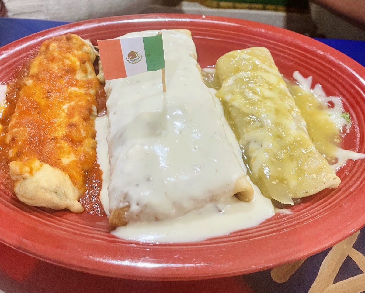 - Chimichanga Beef Tips: A crispy flour tortilla filled with savory beef tips or chicken, accompanied by fried beans and drizzled with nacho cheese sauce, priced at $12.99.